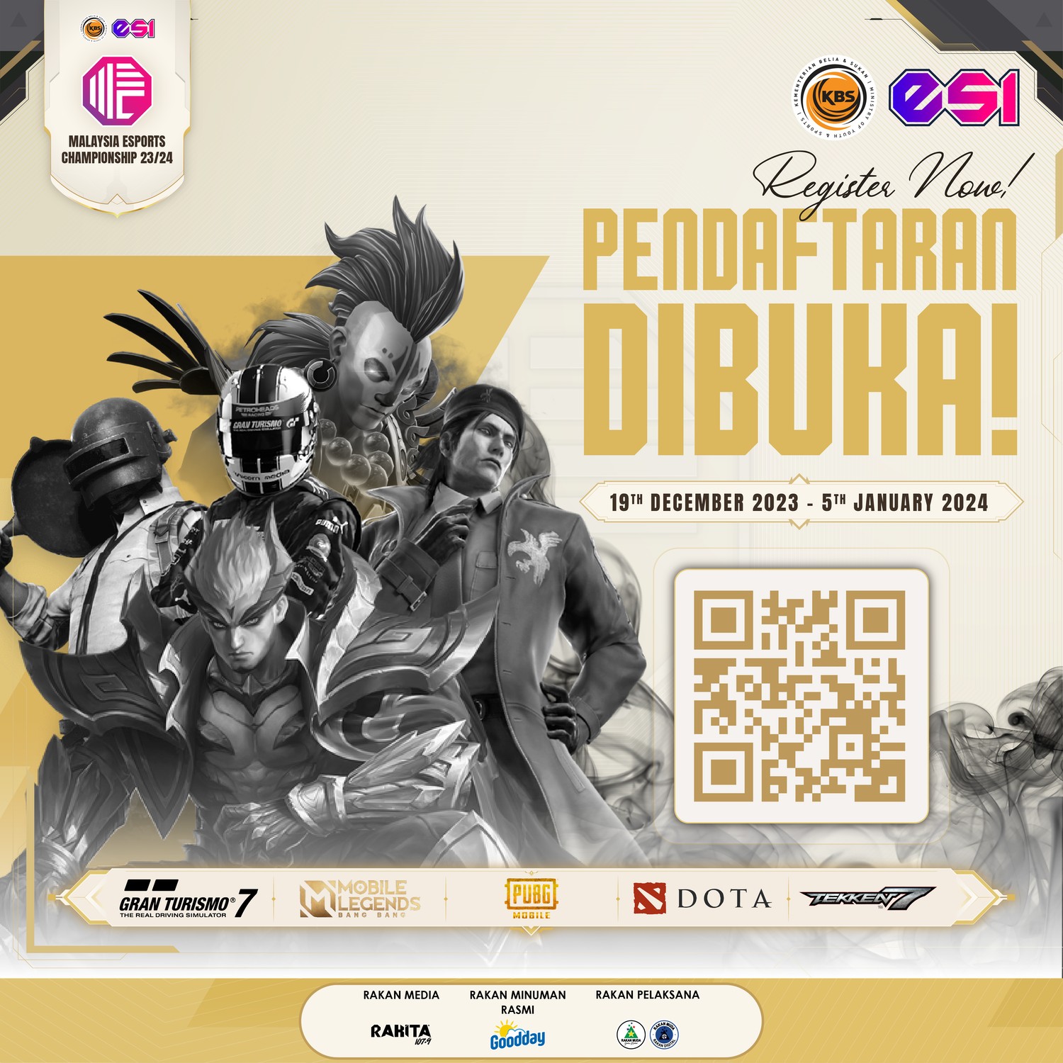 Kejuaraan Esukan Malaysia 23/24 dianjurkan oleh Kementerian Belia dan Sukan (KBS) melalui Esports Integrated (ESI) bersama Rakan Minuman Rasmi, Goodday Milk Malaysia; dan Rakan Aktivasi, Rakan Muda dan Rakan Digital.